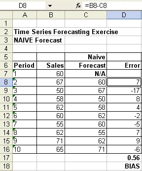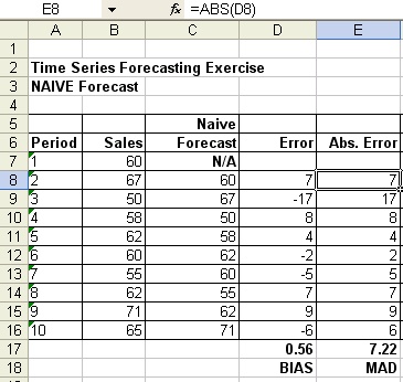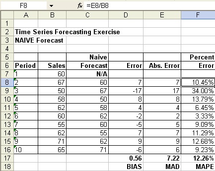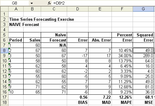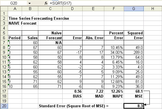 indicators to evaluate model (Bias, MAD, MAPE, MSE, Std Error)